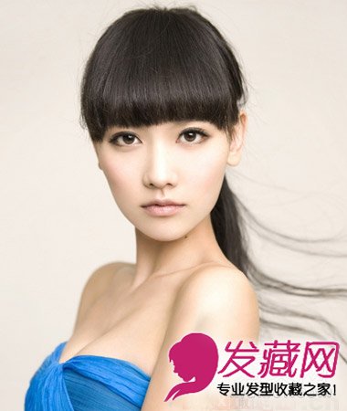 发丝扎一个简单地发束,搭配修剪整齐的平齐刘海发型,甜美可爱。