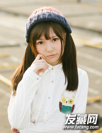 一层轻盈的齐刘海衬托出女生圆圆的大眼睛,遮住了不完美的额头,长发扎起可爱马尾戴上毛线帽,青春有活力温暖小太阳女孩范。