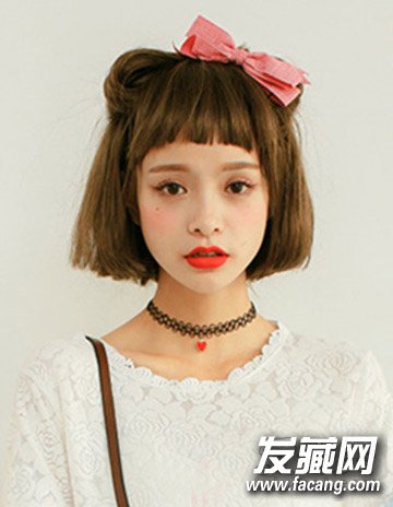 图片,独特的高刘海造型设计再配合时尚的咖啡色染发,整齐而厚重的中短发造型与头顶粉红色的蝴蝶结发饰更添粉嫩可爱感。