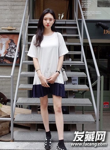 中分卷发发型,简单中分设计搭配休闲装,很显气质,短裙搭配最显高,自然微卷发发型值得一试。