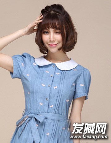 同样是简单的内扣形式的韩式空气感刘海造型设计,再配合清新自然的低调染发与生显蓬松式的波波头造型更添女生的可爱甜美风。
