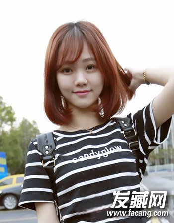 半圆形的斜刘海造型设计可是最显女生十足的温柔淑女风了,再处时尚的棕红色染发设计与简单帅气中
