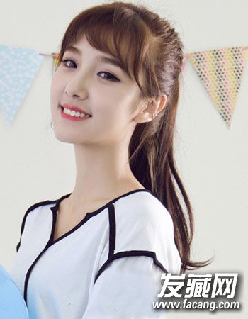 利用的是深棕色的染发颜色来增添女生的清新自然感,再搭配斜刘海形式的空气刘海造型与高马尾的直发扎发同样很显90后女生的甜美可爱风。