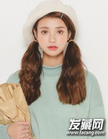 简单利用的是清爽的露额造型将女生精致可爱的鹅蛋脸完美的呈现出来,再搭配时尚的深棕色的染发颜色与双马尾的扎发设计更添十足的清新学院风。