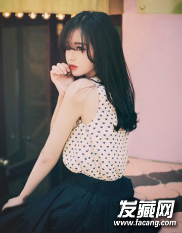 黑色长发在肩头,配上轻薄的空气刘海,甜美清纯,刚刚遮住眼睛的齐刘海给人一种欲说还休的感觉。