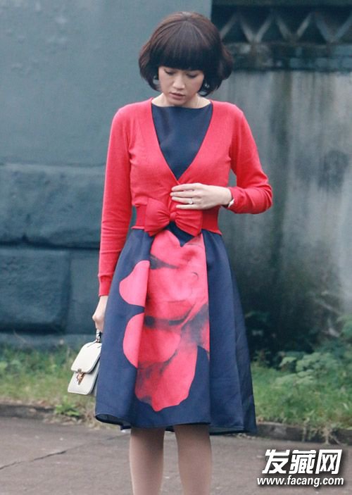 陈乔恩齐刘海短发发型,发尾做烫发处理,更显复古感,搭配小洋装很显少女感。