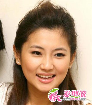 。头顶盘出些许蓬松和凌乱感,更显时尚和青春活力。无刘海的设计突显其可爱的脸容,清爽干净,大方优雅。