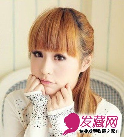 金棕色系显得特别的洋气并且有着洋娃娃般的可爱,搭配齐刘海最能够显得清纯甜美,是扮嫩的最好选择哦!而扎起的马尾更加显得活力四射。