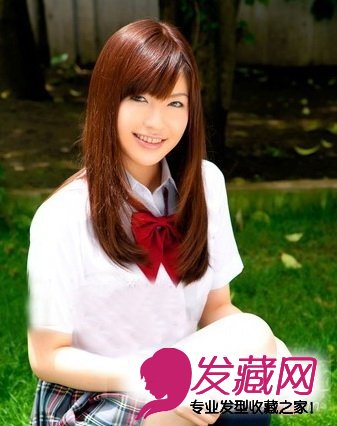 日系的学生发型,棕红色的侧分齐刘海直发,显得女生很文静很淑女,搭配校服最有校花的风格。