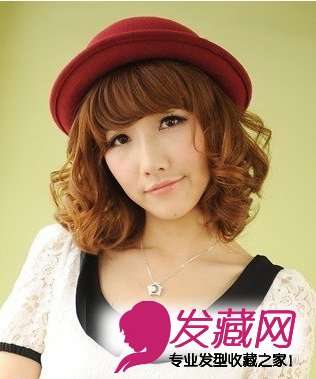 这款短卷发发型图片,给人俏皮可爱的气息,蓬松的卷曲效果打造,非常的富有个性,带有弧度刘海的发型设计,凸显出精致的脸蛋,棕栗色的染发颜色又散发出一丝成熟女性的魅力,红色帽子的搭配,散发出优雅浪漫的女人气质。