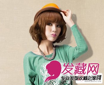 棕黄色蓬松的短发梨花头,下面很好的贴合脸型增加了发型的质感,齐刘海显的可爱动人,配上黄色礼帽,十足的文艺小青年。