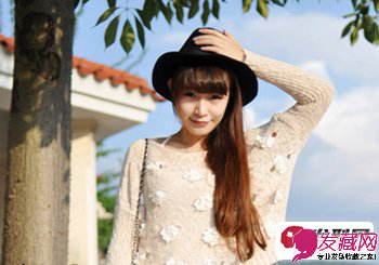 卷烫的齐刘海非常修颜,长发侧放一肩,将小女人的甜美可爱彰显的淋漓尽致,棕色系染发时尚潮流,加上黑色的小礼帽,尽显清新文艺范。