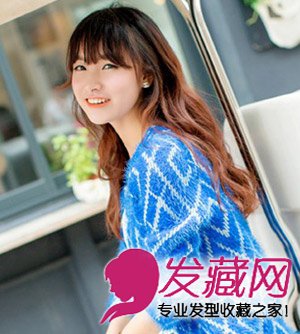 女生挑棕色齐刘海卷发发型,微分的刘海突显的甜美可爱,是款青春活力