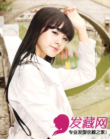 柔顺的长发直发自然的散落让显得随意休闲,齐齐的让造型增添了几分甜美气息,再结合萌萌的表情整个造型让人无法抗拒,是款修颜的
