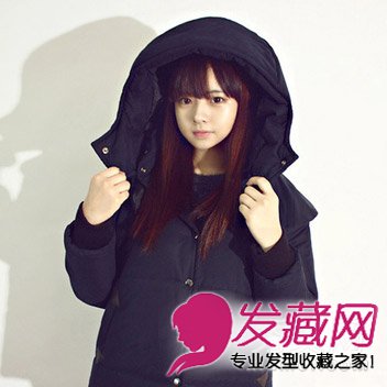 厚重的齐刘海同样有修饰作用,也凸显出女生精致的脸蛋。深棕色染发衬托出白皙的肌肤。柔顺的