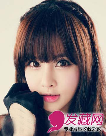 ,齐刘海遮住额头修饰脸型,搭配辫子编发,凸出大大的眼睛,时尚可爱。