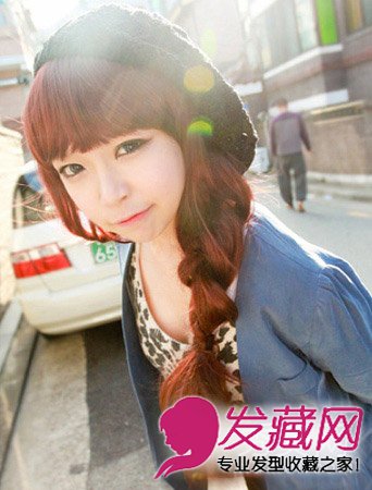 厚厚的齐刘海加上边侧的三股辫子,红棕色的染发和黑色的贝雷帽,都是极为新潮的装扮,十足的时尚街头范。