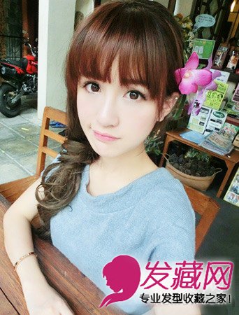 齐刘海也可以很淑女,漂亮的侧面编发,耳后别着的红色花朵。出外旅行梳一个这种头发不但靓丽十足还很方便行动呢。
