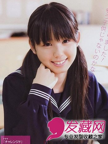 ,很校园气息的齐刘海双马尾扎发,搭配碎剪的齐刘海修饰出精致的小颜脸,甜美清纯的校花范儿。