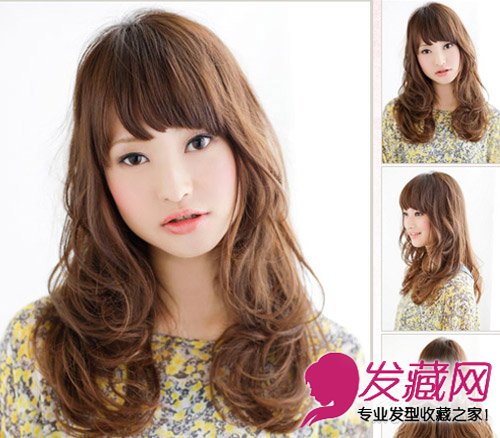 长脸MM可以参考一下这款发型,侧分齐刘海可以遮掩额头,从视觉上改变长脸脸型,从耳旁就开始电卷头发,让大弧度的卷发提升甜美度。