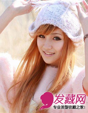 如果在冬季,不妨搭配一个针线帽来增加修脸效果,靓丽的染发瞬间摆脱沉闷的冬日,斜刘海的设计清新甜美,也是非常适合国字脸mm哦。