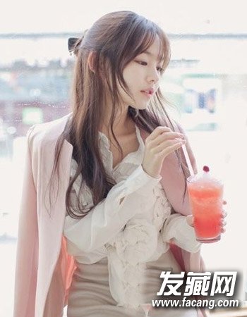 ,简单的一款半扎发发型,可爱的丸子头造型使造型平添了一丝灵动,甜美的空气