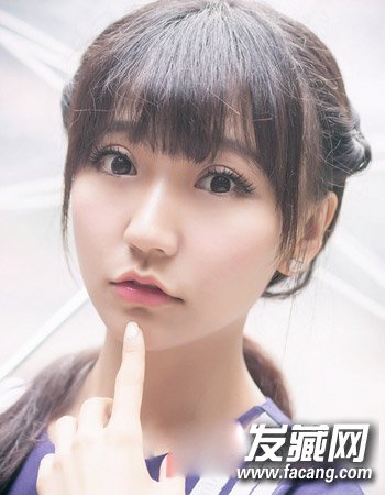 可爱的一款扎发发型,半月形的刘海设计巧妙的修饰窄额头,可爱的低