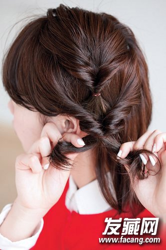 3,下段的编发则是将发梢左右分开,边收紧绑住的打结处边让发梢翘起。