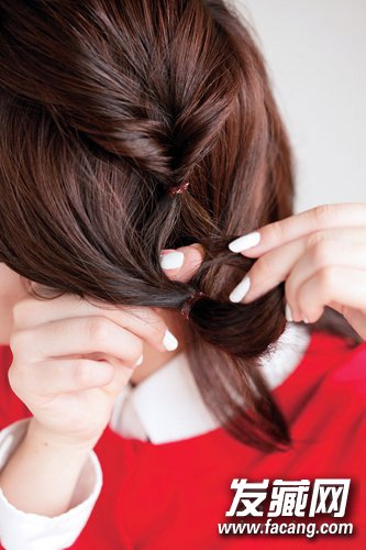 2,剩下的头发左右分开,再进一步上下分段。把上段的发梢卷编起来。