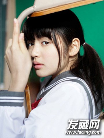 很多校园女生钟爱的一款日系齐刘海扎发,乌黑长发扎双马尾,可爱俏皮,齐刘海留出长鬓发修颜更加瘦脸显清纯。