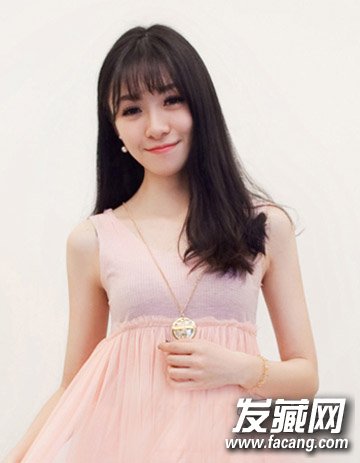 最后同样是一款清纯淑女风式的女生齐刘海发型,简单空气感齐刘海造型本就很显女生十足的清新气质风,而配合浃自然的长直发更是清纯迷人。