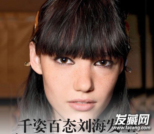 小编点评:长形脸最忌中分直长发以及过长的刘海,这两者都会让额头更高、脸形更长。受到各大品牌秀广泛支持的复古齐刘海,最能让脸形显得小巧。(谨记:长度过眉)