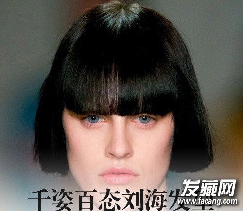 小编点评:长形脸最忌中分直长发以及过长的刘海,这两者都会让额头更高、脸形更长。受到各大品牌秀广泛支持的复古齐刘海,最能让脸形显得小巧。(谨记:长度过眉)