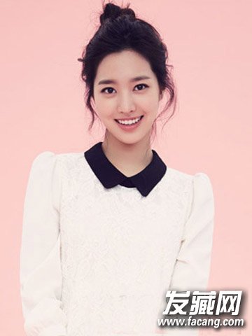 韩式小清新丸子头发髻扎发,乌黑长发扎蓬松感高发髻发型,露额扎发甜美可人,很适合校园女生们打造的可爱发型扎法。