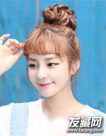 高耸的花苞头扎发发型也是各个年龄层女生们的最爱了,而配合这种明亮的温暖橘黄色染发与清新的空气感刘海更添女生脸型的娇小可爱风。