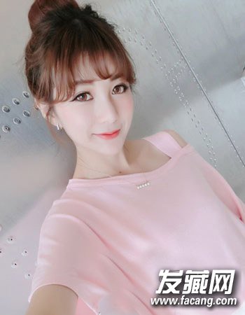 现在处于夏季,妹纸们当然少不了一款清爽的扎发发型了,像这款简单的女生齐刘海形式的高丸子头扎发设计可是最显清爽甜美风式的夏季扎发了。