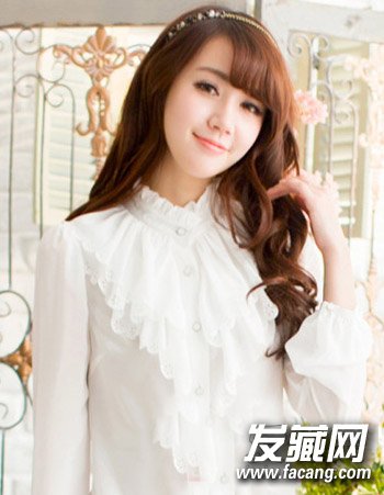 简单的斜刘海造型设计可是最显女生的温柔气质风的了,再配合这种明亮的棕黄色染发设计与丰盈式的长卷发烫发同样很显韩式女生十足的温柔甜美风。