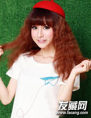 ,利用的是厚重的齐刘海造型设计,再配合这种棕红色的染发设计与丰盈蓬松式的韩式长发小蛋卷头滊发个性十足还显甜美活泼感。