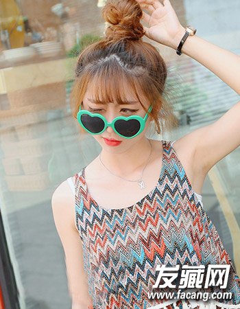 可爱的丸子头扎发发型,蓬松的高扎发型显露出可爱呆萌而又活力四射的一面来,甜美的空气刘海时尚大气。