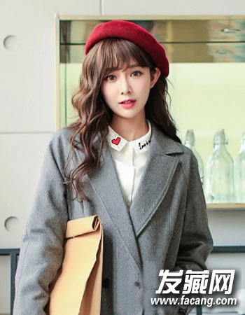 时尚的深棕色的染发颜色魅力吸睛,再搭配简单的齐刘海造型与微显凌乱感的长卷发造型设计,一顶红色的帽子更添名媛淑女范儿。