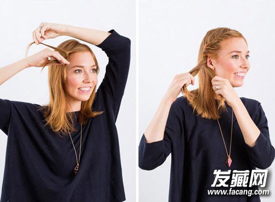 第3步:像编法式辫一样,添加入其他头发,开始编辫子。将脸部周围的头发拧进编成一个小辫子。