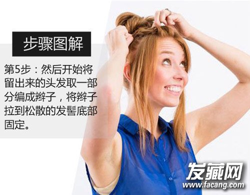 第5步:然后开始将留出来的头发取一部分编成辫子,将辫子拉到松散的发髻底部固定。
