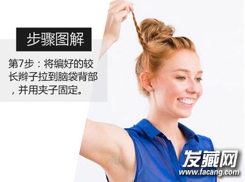 第7步:将编好的较长辫子拉到脑袋背部,并用夹子固定。