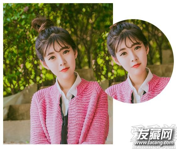 利用的是简单的薄刘海发型设计,而搭配清新低调的自然发色与高耸的花苞头盘发造型,最显女生的甜美可爱粉嫩风了。