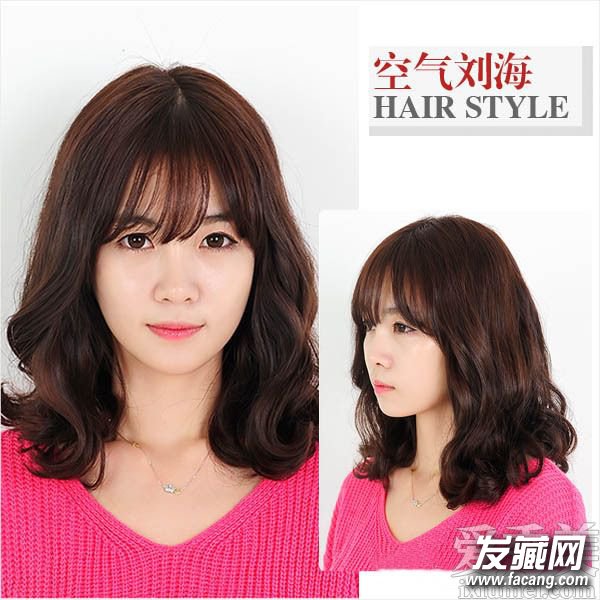 内扣空气刘海搭配内扣带卷发尾,显得十分和谐。这款修颜的梨花头卷发自然散落在胸前,让人感觉很清新甜美。