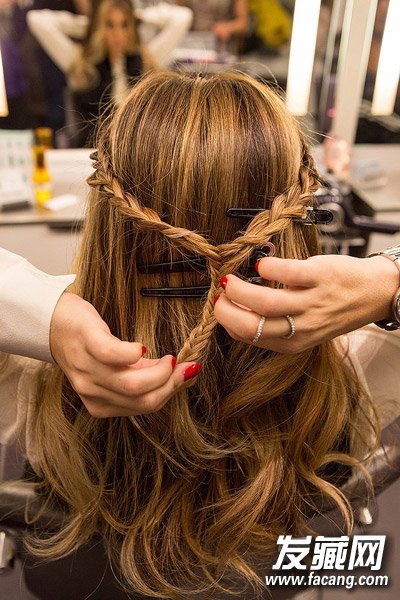 Step 5.把两缕的麻花辫交汇到脑后,并继续编麻花辫。