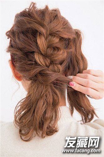 把拧卷的发束弄松,为了隐藏步骤2中的麻花辫结圈而互相交叉在上面并抓到另一边。
