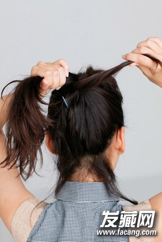 4,从步骤03中抽出细细的发束,卷绕在发圈外并在根部用发卡固定,遮盖住发圈。