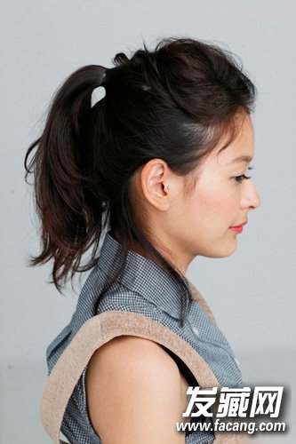 3,把耳上部分的头发在较高位置聚拢,用蝴蝶结发圈扎起。碎发无造作的留出。