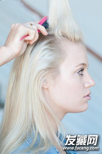 1:取头顶部分的头发,用梳子倒梳发束,将头发打蓬松。